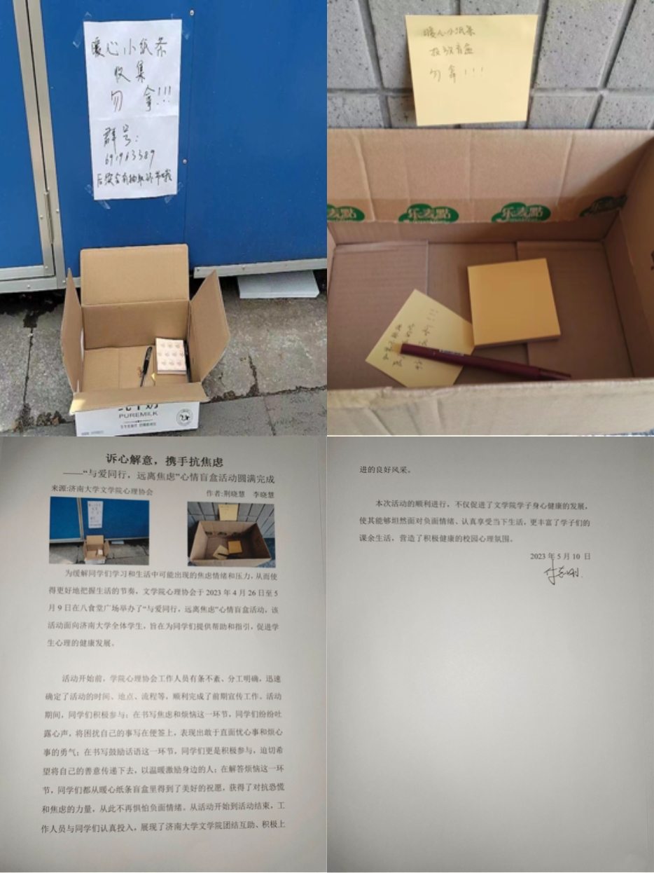 心理协会于2023年4月26日至5月20日在八食堂广场举办了“与爱同行,远离焦虑”心情盲盒活动,该活动面向调教小说