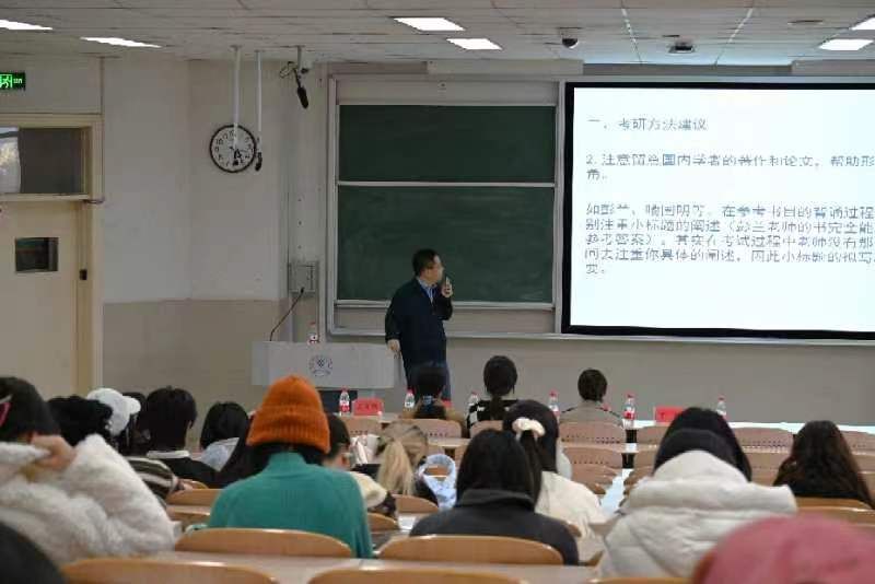 专业导师宋洪民、王恩旭、张斌、丁捷等分别从专业素养的角度向同学们系统全面讲解了如何进行“科学化、数字化、专业化”选择考研院校,“ 明确考研初心,立足自身兴趣,打好专业基础,拓宽知识范围,阅读专业书籍”等建议是来自师者的谆谆教导。