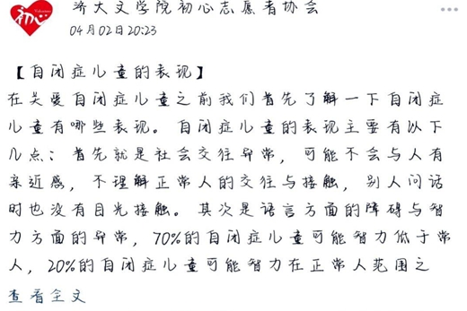 初心志愿者针对世界自闭症日开展了持续两周的“关爱自闭症投稿”的活动。