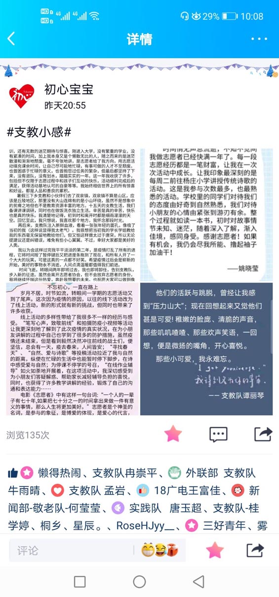 疫情仍阻挡不了爱与温情的传递。本次线上志愿活动,首先由两位志愿者规划了本次活动的流程,发布活动召集投稿。志愿者将自己在支教过程中的感受于周二下午两点之前发送至活动策划人。经志愿者进行编辑排版制成图片后,统一发给调教小说