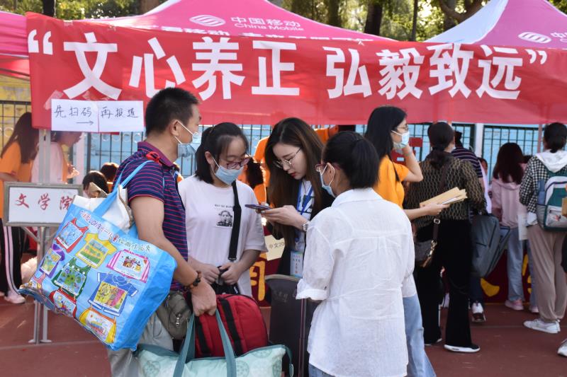 针对疫情防控要求,学院对迎新工作做出了相应调整。迎新工作人员统一着装,佩戴口罩、工作证,以饱满的热情、周到的服务帮助新生顺利入学。从扫码报道、收取材料、核验信息,再到发放《学生疫情防控指导手册》、校园卡等,迎新工作人员分工合作,迎新工作有条不紊。迎新展板图文并茂,配有《文院赋》展示了学院深厚的文化底蕴,家长学生纷纷在展板前合影留念。