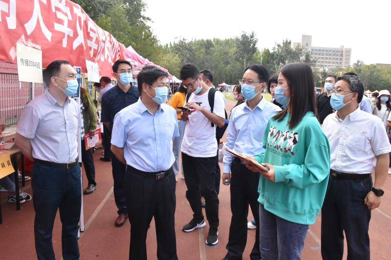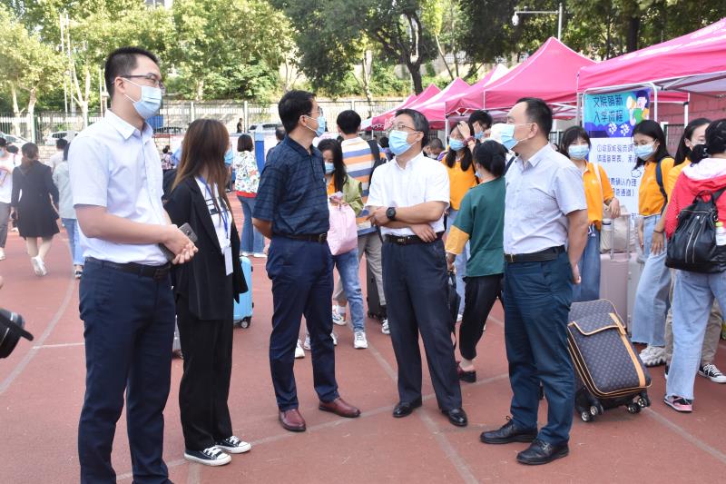 迎新点指导工作,亲切看望学生和家长,慰问迎新工作人员。学院党委书记陈卫东、院长张兵简要介绍了学院迎新准备情况。徐景颜书记与新生和家长进行了亲切的交流,并对他们的到来表示欢迎。