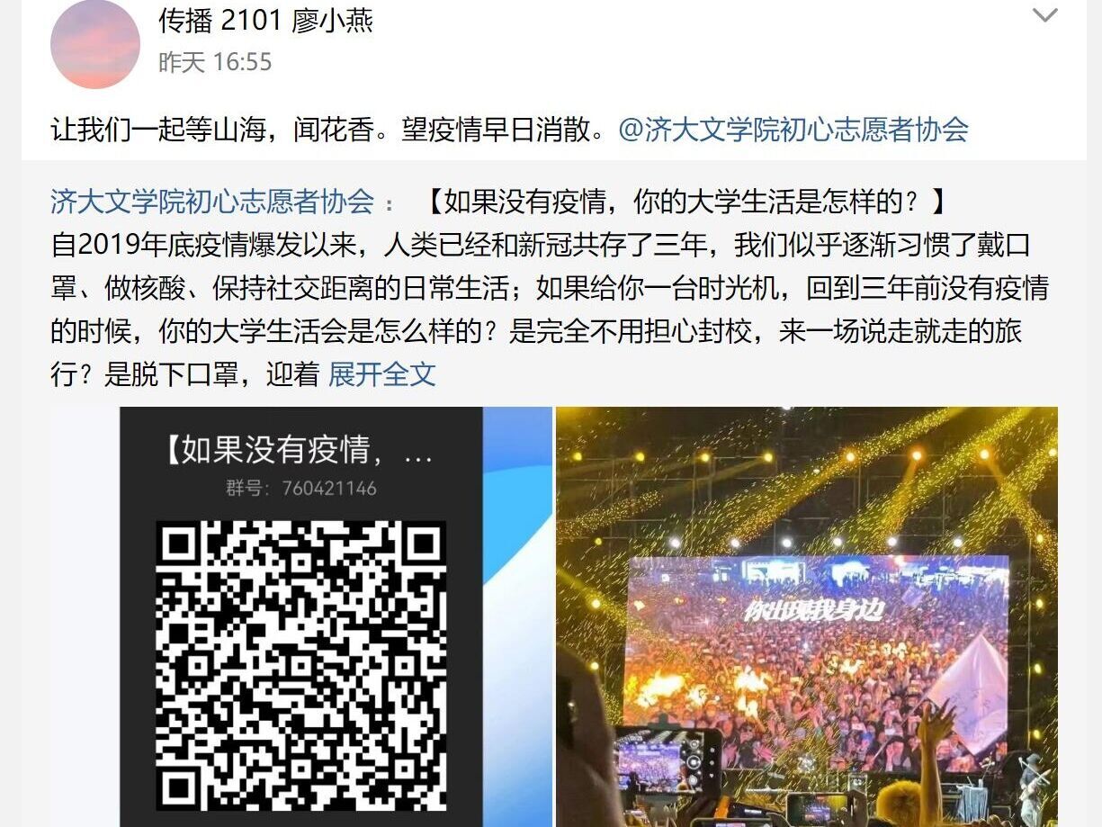 初心志愿者协会官方账号进行活动宣传。活动过程中,同学们纷纷真情实感地写下对疫情结束后生活的美好畅想,抒发心中的希望与喜悦,分享春日美景。此次活动得到了同学们的积极参与,同学们在写下自己希冀的同时阅读他人的诗和远方,不少同学表示通过本次活动,感受到浓浓的暖意,内心的力量愈发坚定。风传花信,雨濯春尘。草木蔓发,春山可望,一切都会好起来的。
