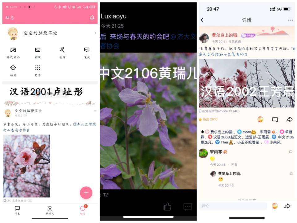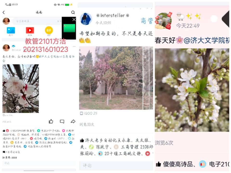 活动期间,活动参与者在自己的朋友圈、QQ空间等新媒体平台分享自己捕捉的春日镜头并配上相对应的描写春日的美妙文字,和朋友们一起分享独属于春天的美好景色:汉语2001班的卢址彤以一句“草木蔓发,春山可望”寄语春天;中文2106班的黄瑞儿用“来场与春天的约会”表达对春的喜爱之情。本次活动得到了同学们的积极参与,同学们纷纷表示,通过欣赏春日的美景,自身烦闷情绪也缓解了不少。在此过程中,同学们观察到自己曾忽视的校园角落美景,让他们更愿意停下脚步,感受日常,展望疫情之后的生活。活动结束后,志愿者协会的工作人员进行后期审查并且总结了本次活动的亮点和不足,为下次类似活动的开展积累了丰富的经验。