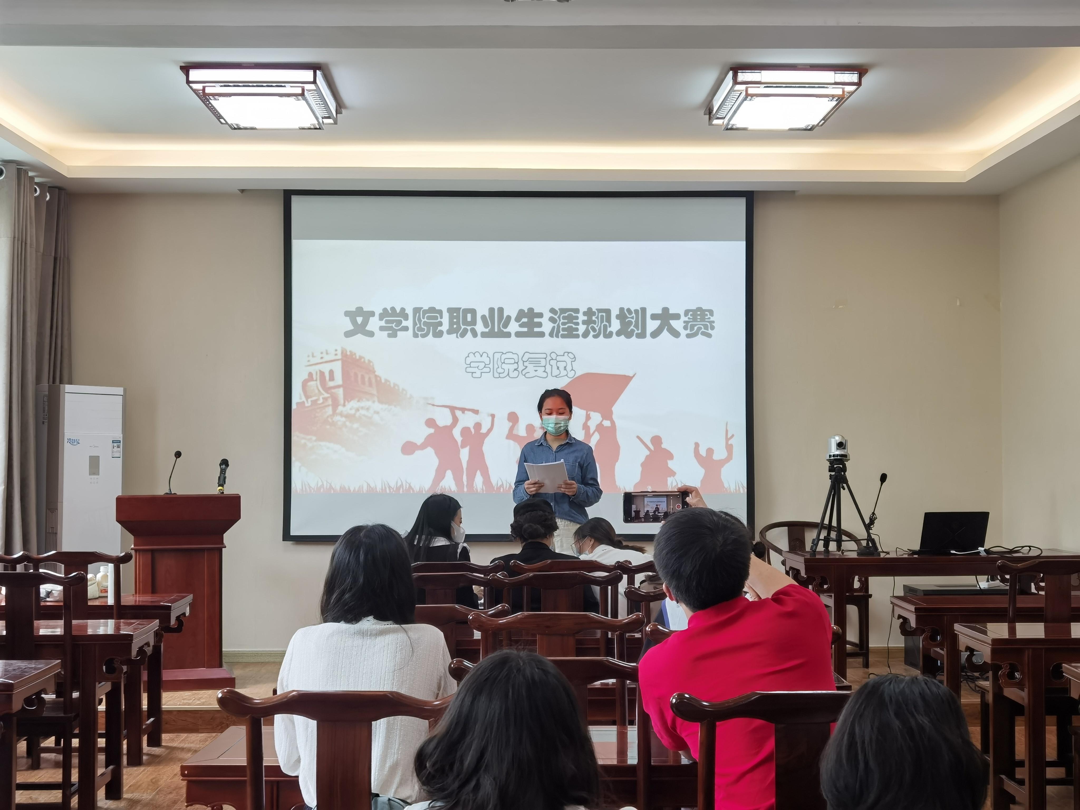 参与此次学院复赛的同学有:中文2106班温安琪、传播2104班桂梦倩、中文2102班张琳若、传播2101班陈靖宇、传播2102班李志彤、汉语2001班许颖、传播2104班高欣宇、中文2104班段瑞雪、广电2002班封盼、广电2002班李梦瑶、传播2102陈艺清。学院复赛分为三个环节。第一个环节由主持人宣布赛制规则并为评委发放评分表,第二个阶段为同学们依次上台发言,主要介绍自己的基本履历、个性特征、未来发展方向规划,第三个环节是核算分数并完成公示,老师对入围同学的作品进行二次指导。在第二个环节中,十一位同学基于自己的职业生涯规划书,对日后自己的生涯规划做出了进一步的阐释,老师也通过询问问题对同学们进行了深入的了解。