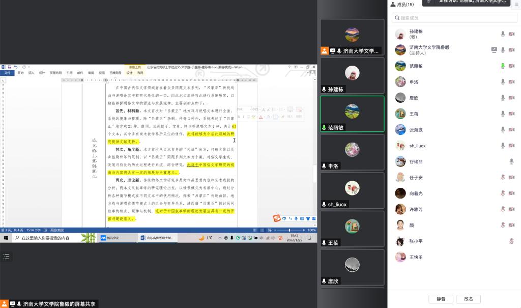 首先,鲁毅副院长介绍前期经过学院推荐、学校筛选,由范丽敏教授指导的研究生于鑫源,其硕士论文《“吕蒙正”传统戏曲与说唱研究》获推参评省级优秀硕士论文;由唐欣教授指导的研究生任子安,其申报的成果“对话教学理念下的中学语文教师课堂理答行为研究及实践探索”获推参评省研究生创新成果;张海波老师的“出土文献语言文字专题”获推参评省级优质课程。
