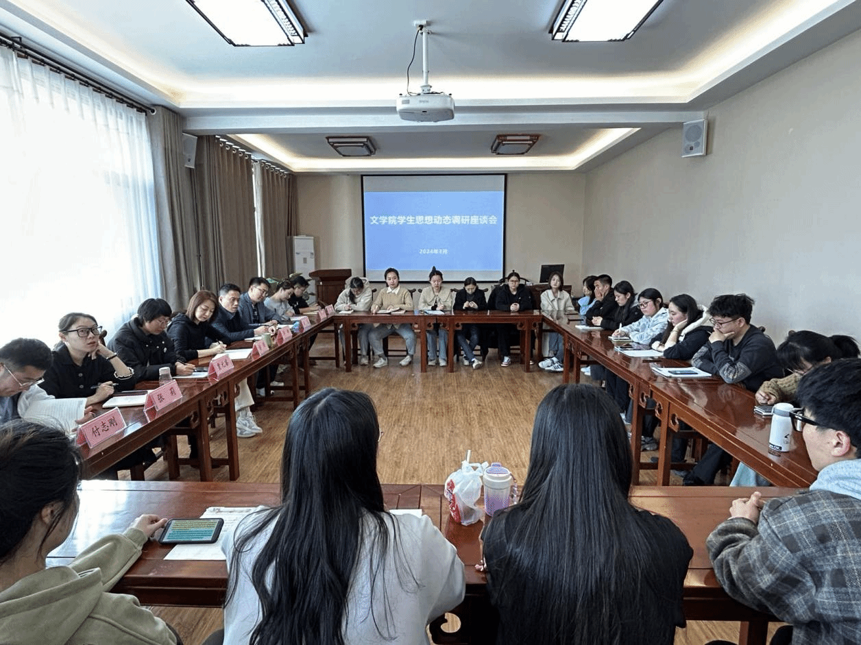 在3教419召开本学期学生思想动态调研座谈会,学院党委副书记、副院长潘颖,挂职党委副书记李杨,全体辅导员,教学管理办公室相关人员,各年级学生代表、少数民族学生代表、各学生组织代表参加座谈。