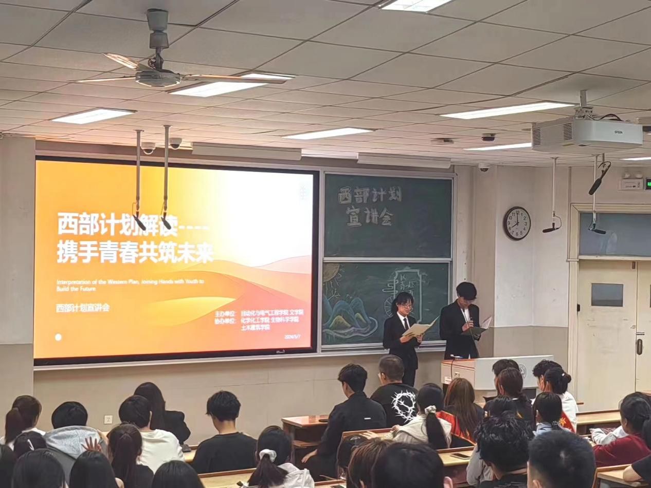与自动化与电气工程学院、生物科学与技术学院等五个兄弟学院于5月7日晚共同举办了“携手青春,共筑未来”西部计划宣讲会。