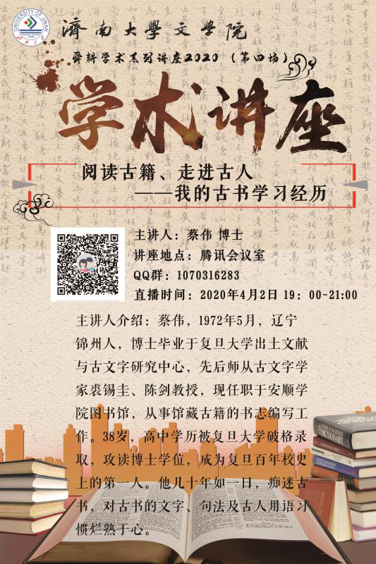 “舜耕学术系列讲座2020”第四场如期举行,邀请复旦大学出土文献与古文字研究中心博士、安顺学院图书馆蔡伟老师,做了《阅读古籍、走进古人——我的古书学习经历》的讲座。本次讲座采用腾讯直播的方式,一百六十多名院内外师生参加线上交流互动。