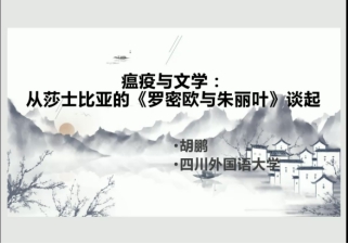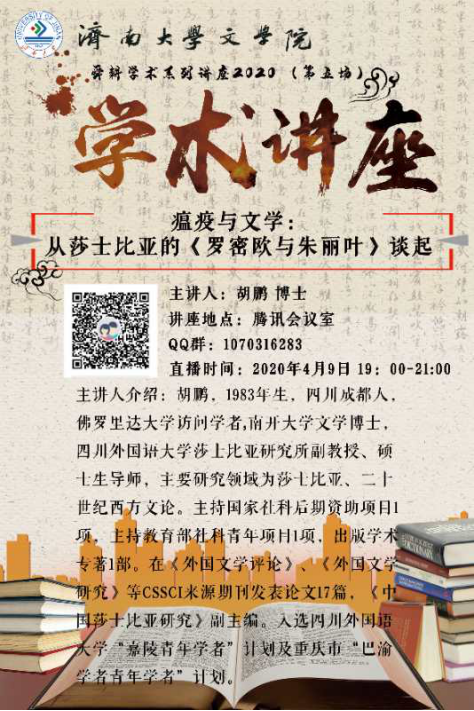 4月9日晚,“舜耕学术系列讲座2020”第五场如期举行。本期邀请到了佛罗里达大学访问学者、四川外国语大学莎士比亚研究所副教授胡鹏先生,讲座题目为《瘟疫与文学:从莎士比亚的<罗密欧与朱丽叶>谈起》。本次讲座采用腾讯课堂直播,调教小说