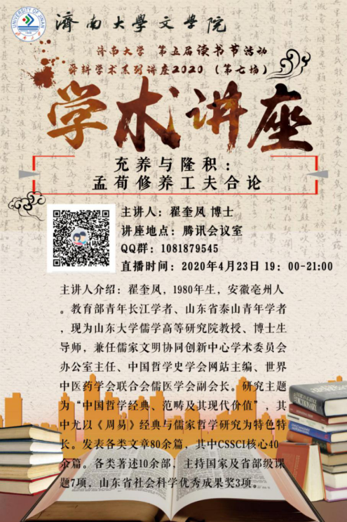 主讲人介绍:翟奎凤,1980年生,安徽亳州人。教育部青年长江学者、山东省泰山学者青年专家,现为山东大学儒学高等研究院教授、博士生导师,兼任儒家文明协同创新中心学术委员会办公室主任、中国哲学史学会网站主编、世界中医药学会联合会儒医学会副会长。研究主题为“中国哲学经典、范畴及其现代价值”,其中尤以《周易》经典与儒家哲学研究为特色特长。发表各类文章80余篇,其中CSSCI核心40余篇。各类著述10余部,主持国家及省部级课题7项,山东省社会科学优秀成果奖3项。