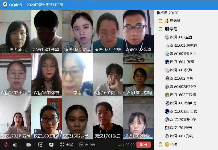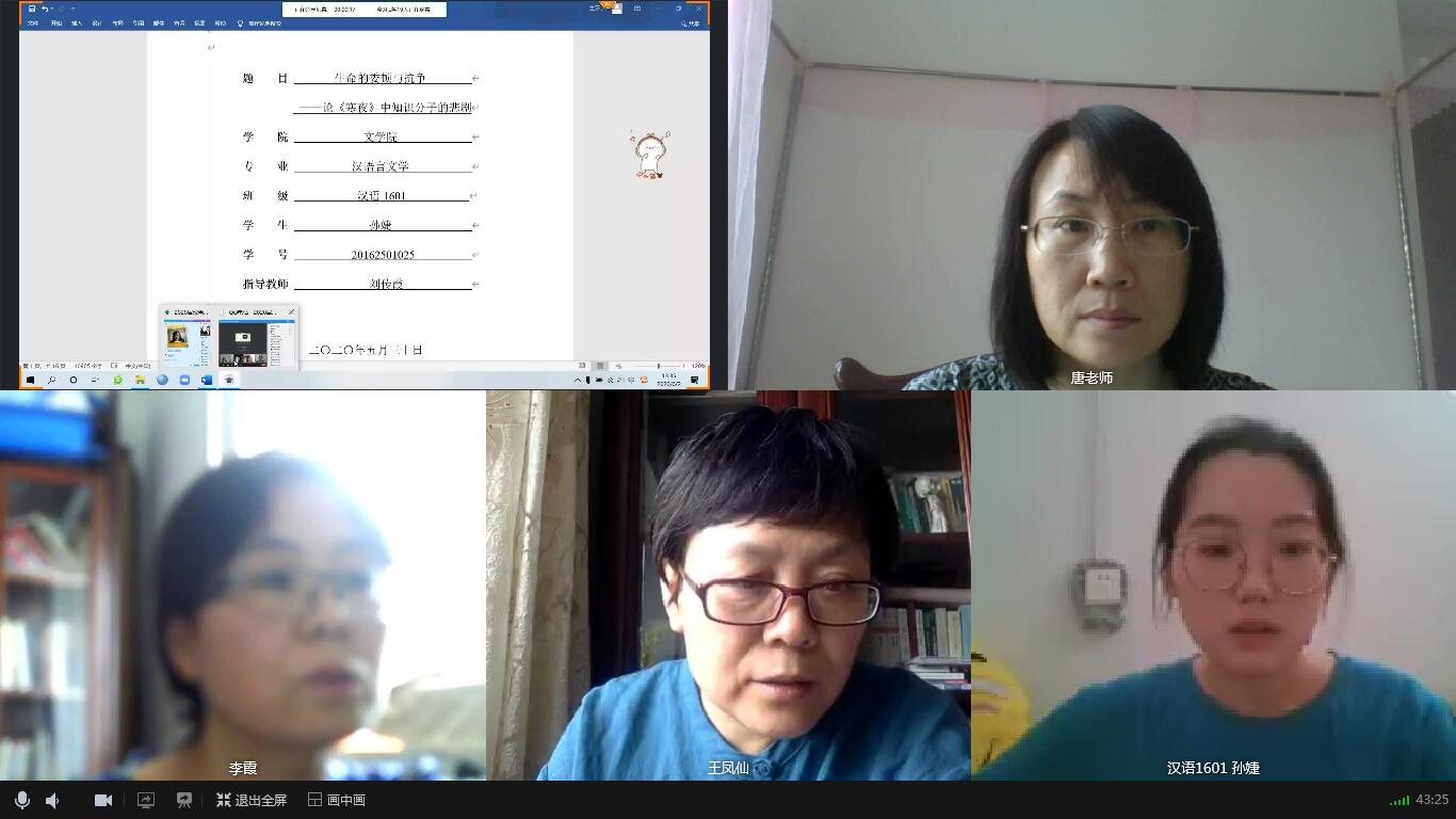 2020年6月9日下午13点,调教小说 2020届本科毕业生第二次答辩顺利举行。第二次答辩依然采用线上答辩,共分为汉语言文学、新闻传播学两组,共有10名学生参加,7名教师参与答辩工作。经过第二次答辩,10名学生顺利通过。
