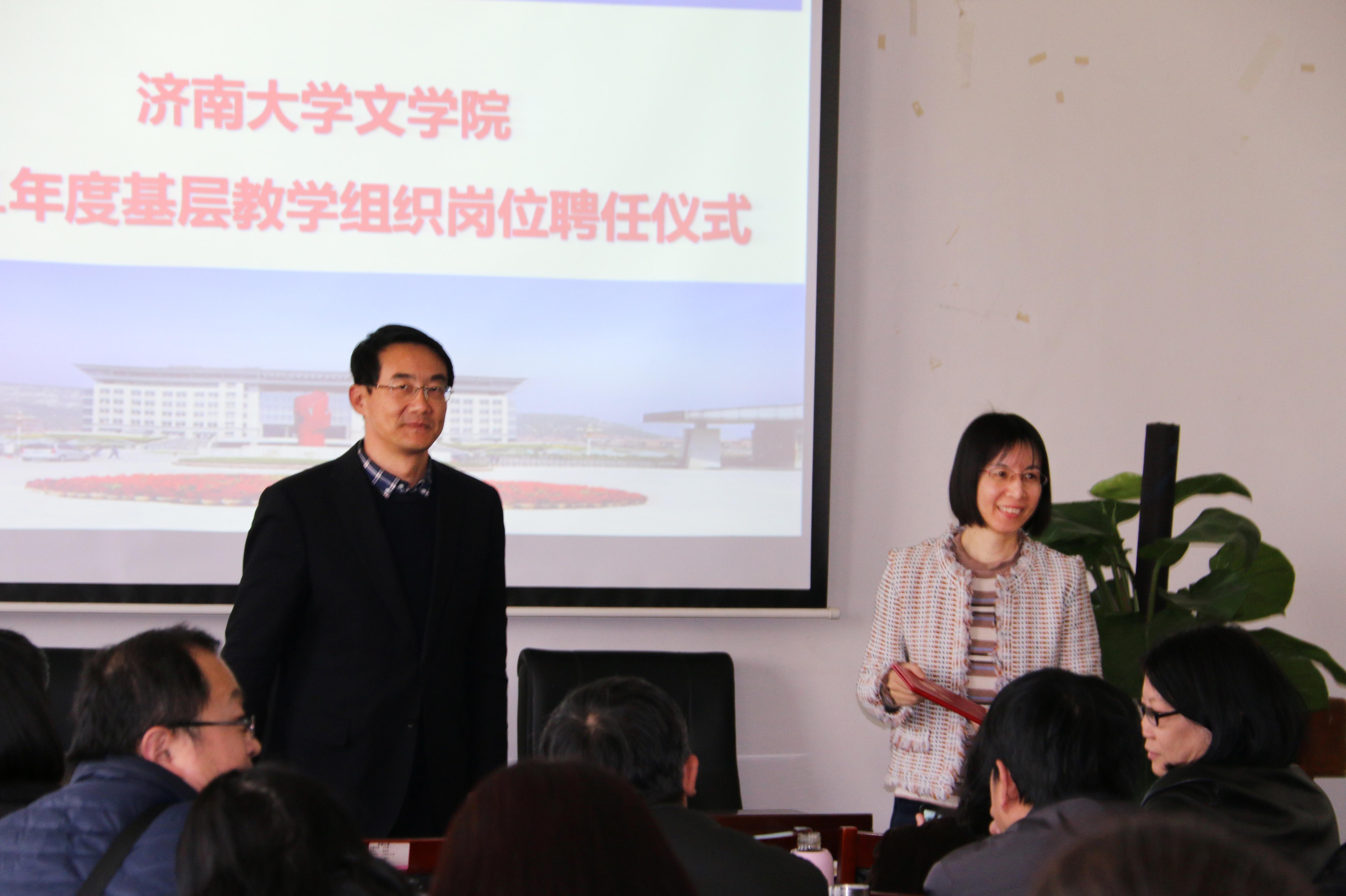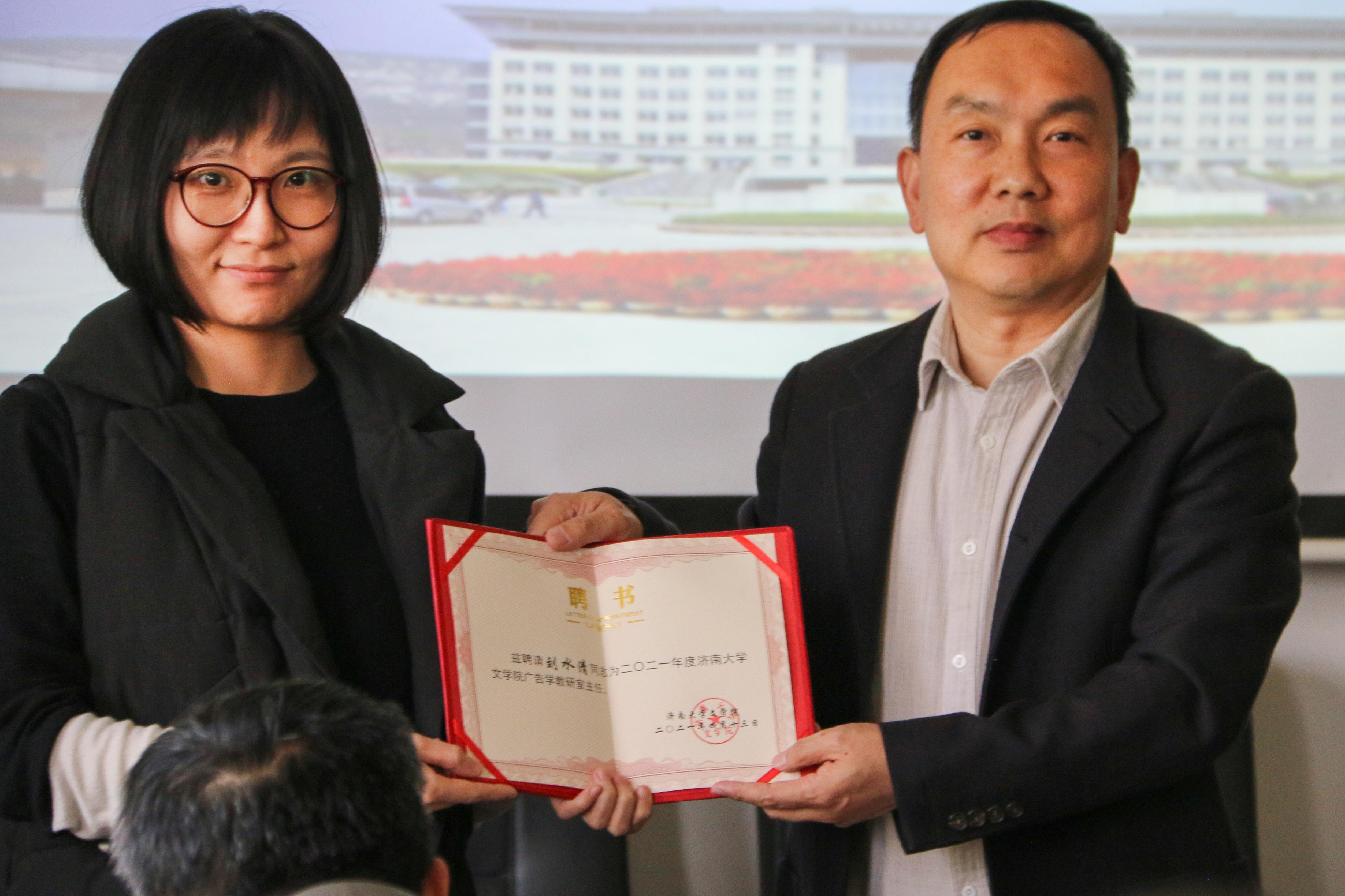 基层教学组织负责人聘任决定》,决定聘任王蓓等10人担任学院教研室主任、聘任蒋莹担任汉语言文学专业实践教学负责人,同时决定推荐张小平等4人分别担任汉语国际教育、广播电视学、广告学、编辑出版学专业负责人。随后,陈卫东书记、张兵院长分别向新聘任的教师颁发了聘书,并合影留念。至此,聘任仪式圆满结束。