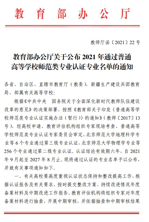 近日,教育部公布了2021年通过普通高等学校师范类专业认证专业名单,我校调教小说