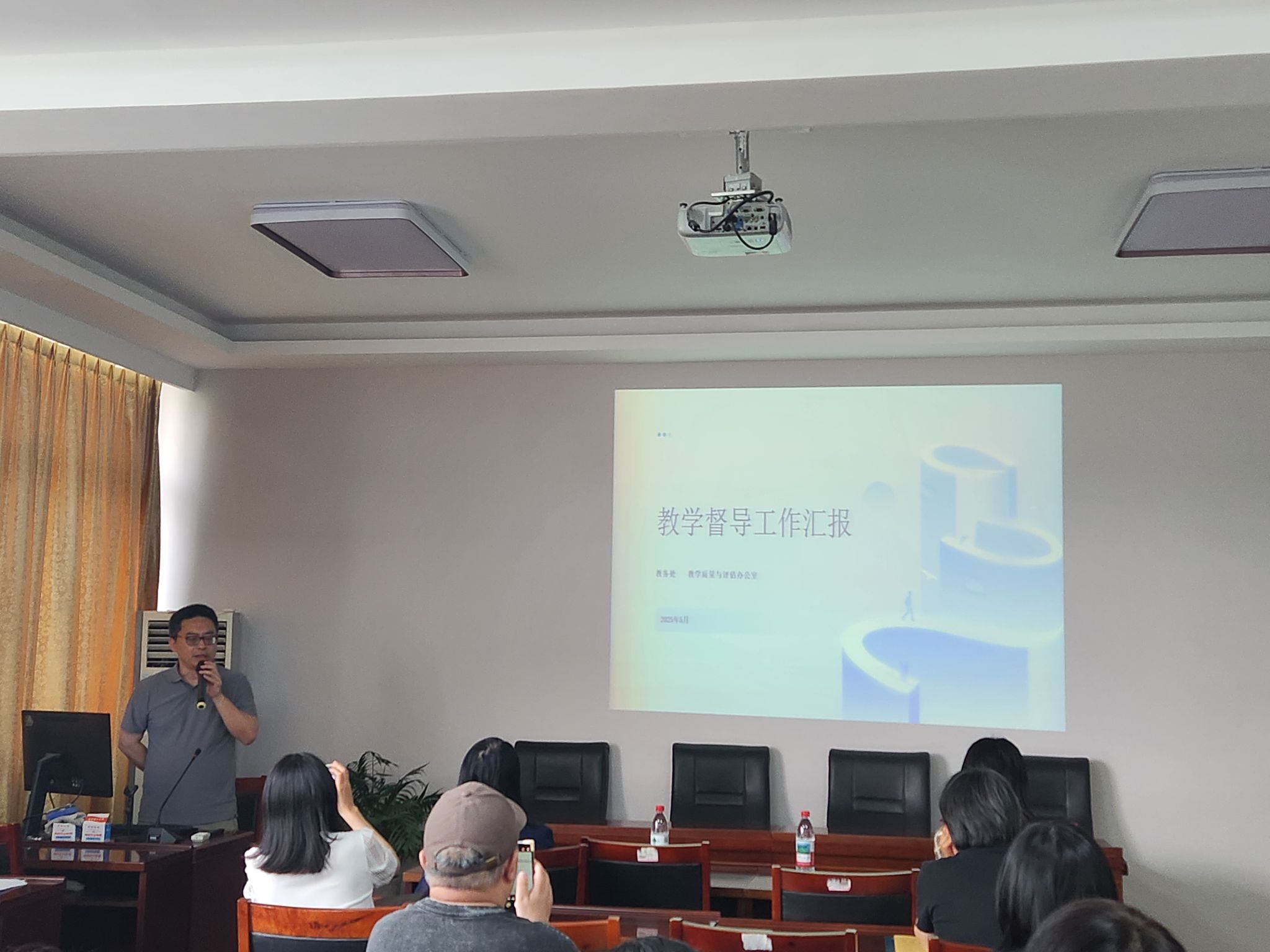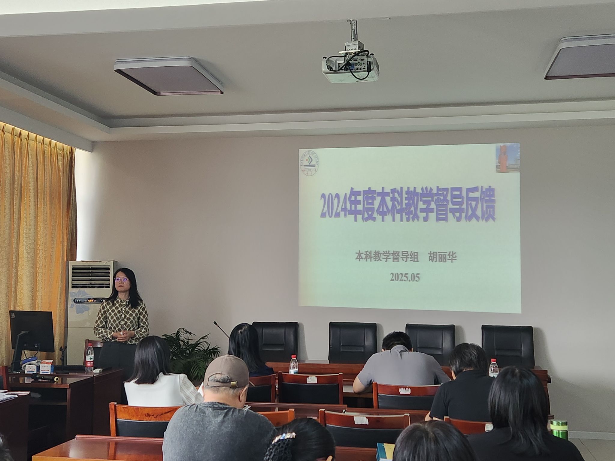 召开本科教学督导反馈会暨“本科教学质量提升年”专题教学活动。教务处副处长、教学质量与评估办公室副主任张杰,本科教学督导组组长胡丽华,学院领导班子及全体教职工参加会议。会议由学院院长范丽敏主持。