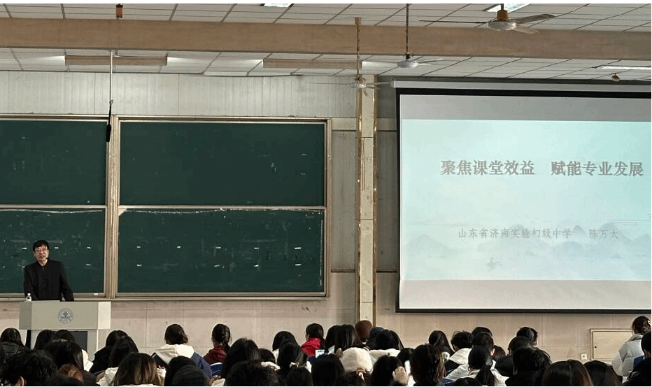 特邀济南实验初级中学特级教师陈万太莅临星硕教室,开展以“聚焦课堂效益 赋能专业发展”为主题的教育见习专题讲座。讲座中,陈万太老师结合自身教育教学与成长经历,为2023级汉语言文学专业全体师生带来了干货满满的分享。他强调,课堂是教师的核心阵地与安身立命之本,教师可通过对语文课文进行文本类型细分,精准聚焦课堂核心效益,让教学更具深度与含金量,既为自身专业发展注入强劲动力,也能为学生的长远成长筑牢根基。