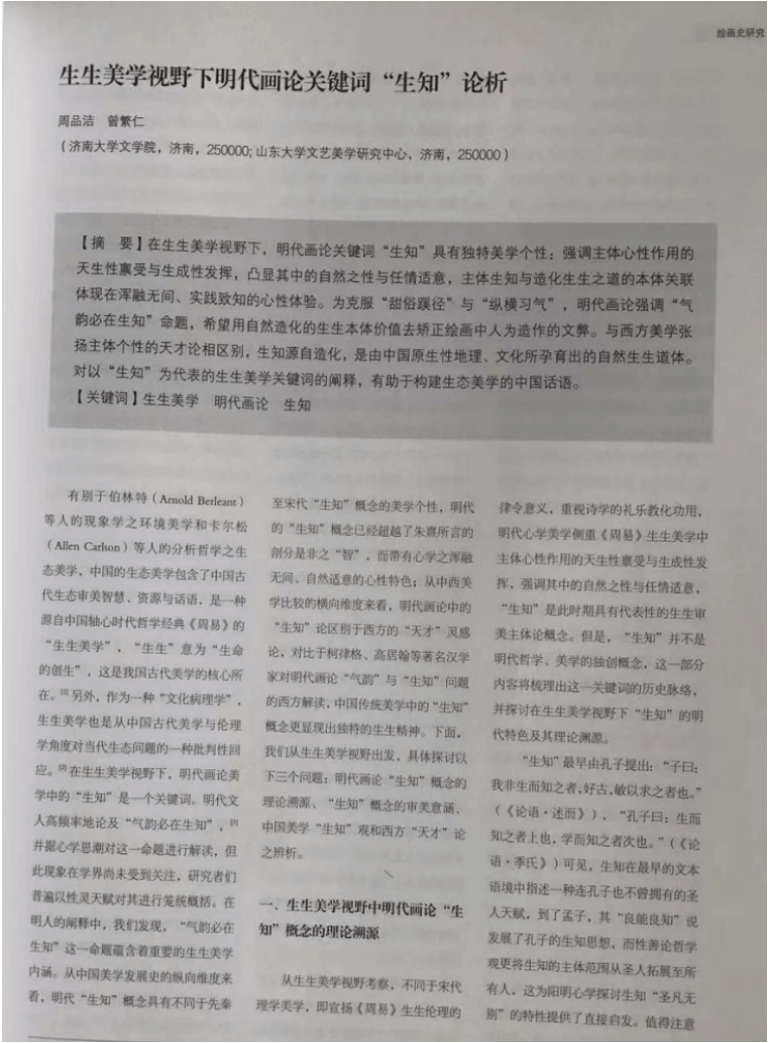 周品洁博士的论文《生生美学视野下明代画论关键词“生知”论析》于《中国美术研究》(CSSCI集刊)2024年第1期(总第49辑)发表。