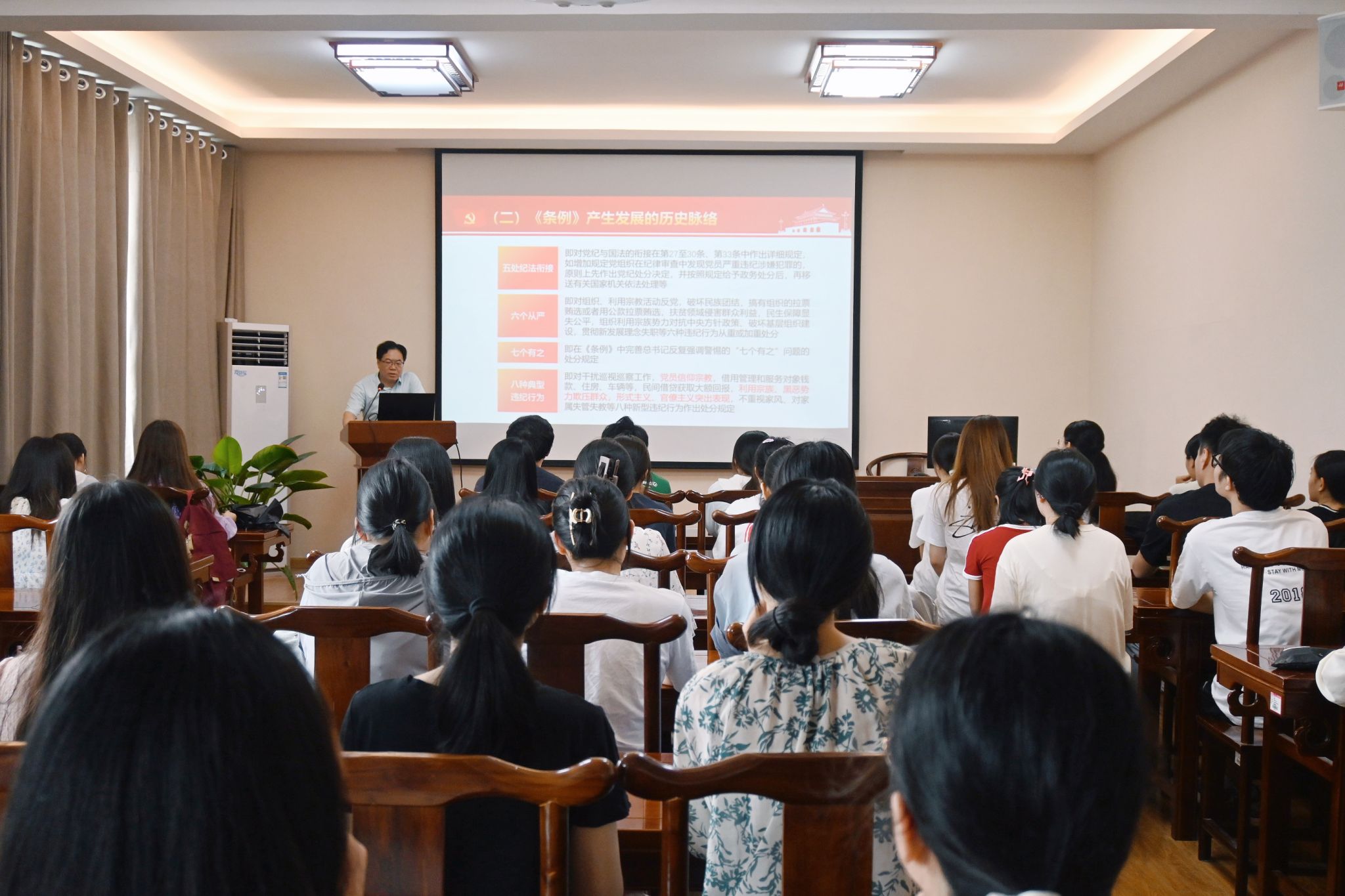 为推进党纪学习教育走深走实,教育引导青年学生学纪、知纪、明纪、守纪, 6月14日,学院党委书记董海军为学生党员讲授党纪学习教育专题党课。学院各学生党支部书记、学生党员参加学习。