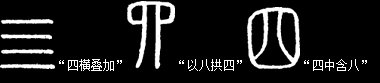 “四”字写法有三,籀文写作“四横叠加”之象,是数量之增加,犹如今日所用“阿拉伯数字”之“4”,但其义尚丰于“4”;古文写作“以八拱四”之象,若八卦之承四象;规范写法则是“四”,有“四中含八”之象,若八卦寓于四象之中。