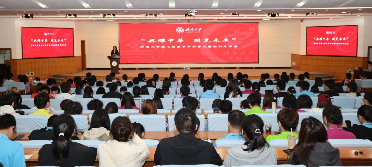 党委书记董海军致辞。他指出,读书节作为经典的校园文化品牌活动,在知识传递、文化传承等方面发挥了重要作用。他倡议广大学生一要强化经典阅读,坚定理想信念;二要坚持学以致用,涵养人文底蕴;三要打造文化品牌,凝聚济大精神。